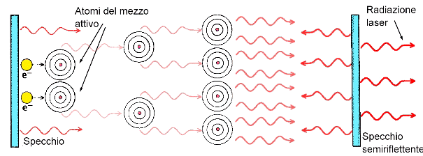 Durante questo decadimento stimolato ciascun atomo emette un fotone; supponendo che tutte le transizioni avvengano tra gli stessi due livelli energetici, tutti i fotoni devono avere la stessa energia e di conseguenza la stessa lunghezza d'onda. In base ai principi della meccanica quantistica si può dimostrare che essi vengono emessi nella stessa direzione e con la stessa fase dei fotoni incidenti. Il processo si ripete via via che i fotoni vengono riflessi avanti e indietro tra due specchi, fino a che si forma una "valanga" di fotoni, tutti della stessa lunghezza d'onda, tutti in movimento nella stessa direzione e tutti in fase. Da questo concetto deriva l'acronimo "L.A.S.E.R." cioe', amplificazione della luce mediante emissione stimolata di radiazione (Light Amplification by Stimulated Emission of Radiation).